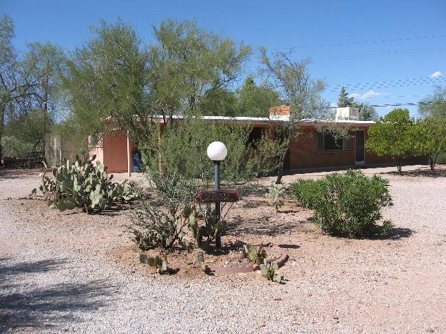 Front of house view with lampost. Note low sloped roof, white seal coated recently.