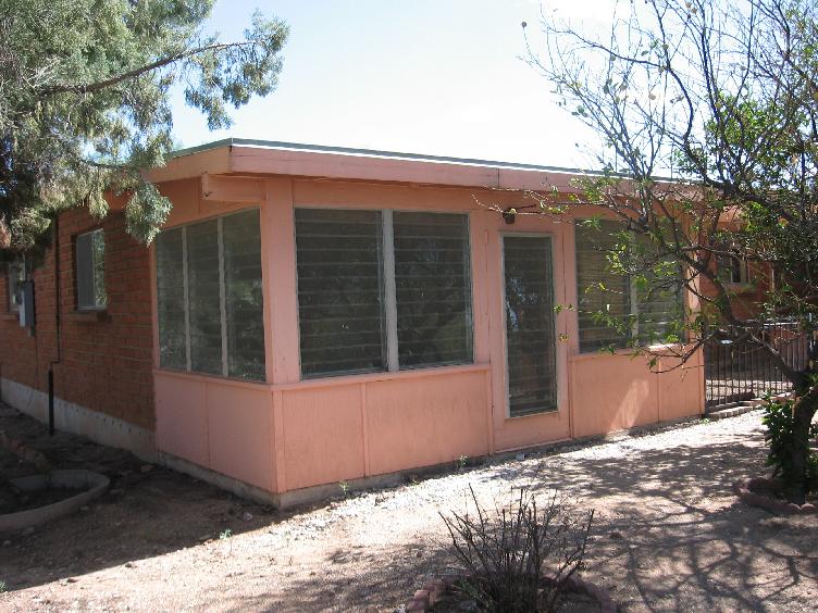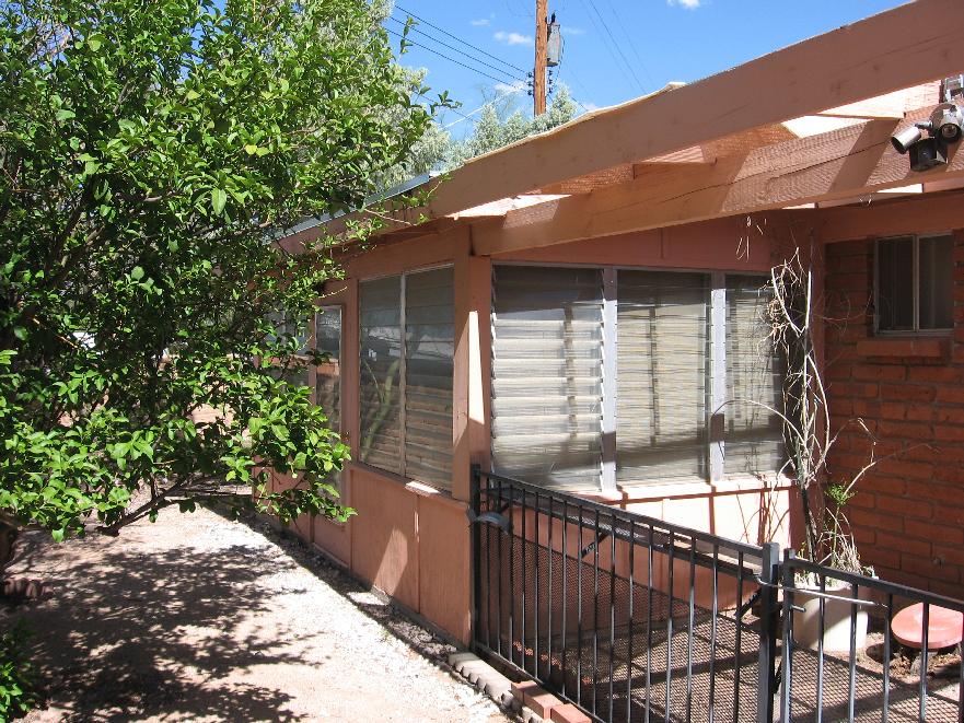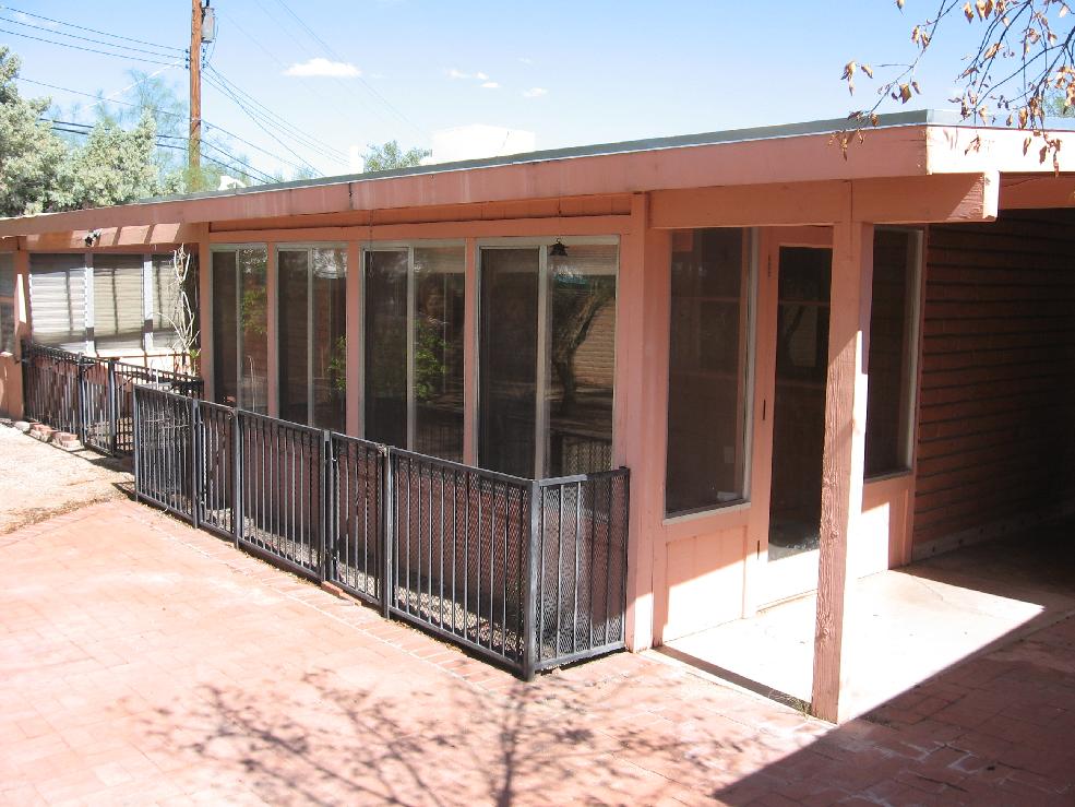 Sun room outside dining room door. Note fencing to protect plants from Javelina and rabbits. Probably put in potted flowers along windows. Windows slide open.