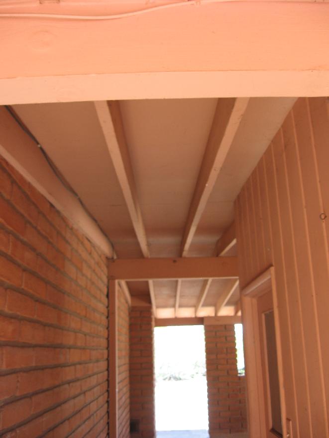 House end of Carport, roof structure and beam runs thru entire adbobe house. Roof rafters are 16 inch on center, I think. House has sheathing, ceiling and ??? insulation between rafters.